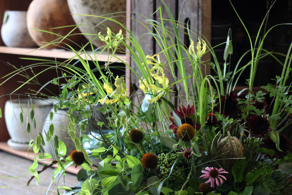 山に生えているような枝物や野に咲く繊細な草花のようなものを多く取り揃えています。